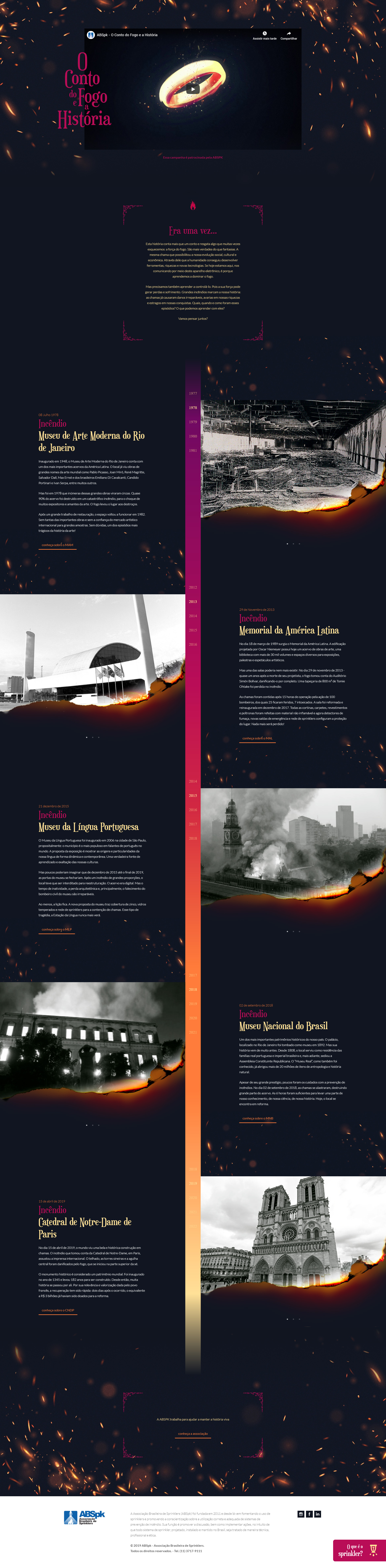 10No dia 02 de setembro de 2018, o Museu de História Nacional do Rio de Janeiro sofreu um incêndio que destruiu 90% do seu acervo e o acidente poderia ter sido evitado se o museu tivesse um sistema de segurança contra incêndio devidamente instalado. Outros incêndios em museus e edifícios históricos ocorreram no mundo e também sofriam do mesmo problema. “O Conto do Fogo e a História” é uma campanha de conscientização para os perigos do fogo se não for controlado. Criado para a ABSpk, Associação Brasileira de Sprinklers.